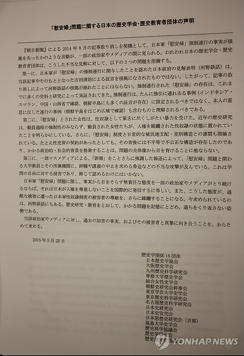 이들 단체는 이날 중의원 제2의원회관에서 발표한 '위안부 문제에 관한 일본의 역사학회·교육자단체의 성명'에서 일본군 위안부 문제에 관해 "강제연행된 위안부의 존재는 그간의 많은 사료와 연구에 의해서 실증돼 왔다"고 밝혔다.