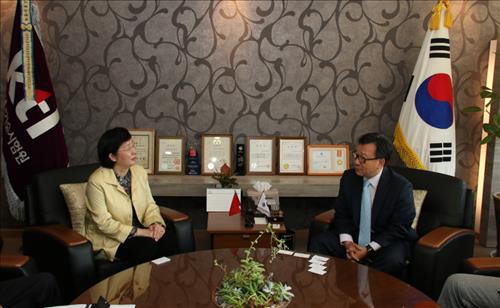 | △ 한국산업기술시험원 이원복 원장(오른쪽)은 26일 서울 구로구 서울지역본부에서 중국 CFDA 지아오 홍 부국장의 방문을 받고 양국 간 시험인증 분야 협력증진 방안 등을 논의했다. |