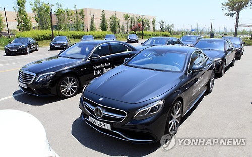 | △ 벤츠 인텔리전트 드라이브 시연 (고양=연합뉴스) 김승두 기자 = 메르세데스-벤츠 코리아가 26일 일산 킨텍스에서 플래그십 모델 S 클래스를 통해 혁신적인 인텔리전트 드라이브(Intelligent Drive) 기술을 소개하는 워크숍을 개최했다. 이날 드라이브 시연을 위해 벤츠 자동차들이 준비된 모습. |