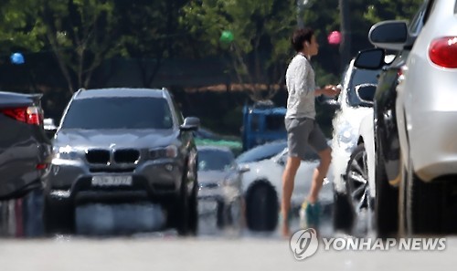 | △ 더위 속 타오르는 아스팔트 (서울=연합뉴스) 한종찬 기자 = 서울 낮 기온이 29도를 기록한 26일 오후 서울 삼성동 코엑스 인근 아스팔트 도로 위로 아지랑이가 피어오르고 있다. |