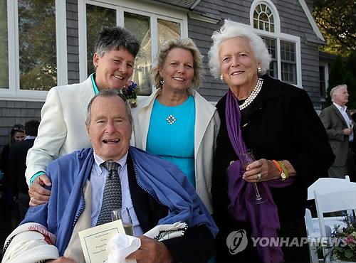 | △ 보수 성향의 조지 H.W 부시 전 미국 대통령 내외가 2013년 레즈비언 커플이자 친구인 보니 클레멘트(부시 전 대통령 뒤)와 헬렌 토르갈센의 결혼식에 증인으로 참석해 세계적인 화제를 모았다. |