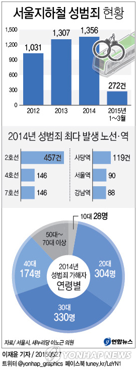 전국 지하철 성범죄는 2012년 1천31건, 2013년 1천307건, 지난해 1천356건으로 계속 증가하고 있다. 올해도 1월부터 3월까지 벌써 272건의 성범죄가 발생했다.