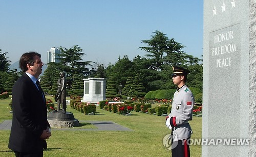 | △ 유엔기념공원 미군묘역 참배하는 리퍼트 대사 (부산=연합뉴스) 마크 리퍼트 주한 미국대사가 27일 주한 미국대사로는 처음으로 6·25 전쟁에 참전해 전사한 유엔군들의 유해를 모신 부산의 유엔기념공원을 참배하고 있다. 2015.5.27 <<새누리당 김정훈 국회의원실>> pitbull@yna.co.kr |