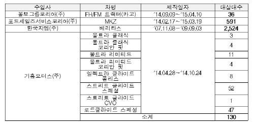 볼보FH/FM 화물자동차는 엔진을 점검할 때 운전실 부분을 들어 올려 고정하는 볼트에 문제가 발견됐고, 포드 MKZ승용차는 주차등 광도가 밝아 마주 오는 운전자의 시야를 방해할 가능성이 제기됐다.
