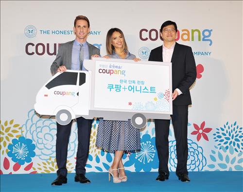 쿠팡 김범석 대표는 28일 오전 서울 삼성동 그랜드 인터컨티넨탈 호텔에서 제시카 알바와 함께 기자간담회를 열고 앞으로 쿠팡에서 패션 기저귀 등 어니스트 컴퍼니의 유아용품을 국내 단독으로 판매한다고 밝혔다.