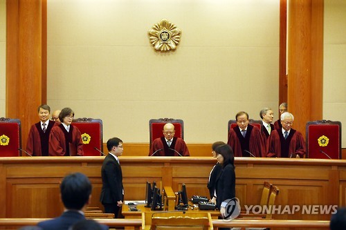 | △ 대심판정 들어서는 박한철 소장 (서울=연합뉴스) 박동주 기자 = 박한철 헌법재판소장이 28일 오후 전교조를 법외노조로 판정한 근거인 교원의 노동조합 설립 및 운영에 관한 법률에 관해 서울고법이 제청한 위헌법률심판 사건 선고를 위해 서울 헌법재판소 대심판정으로 들어서고 있다. |