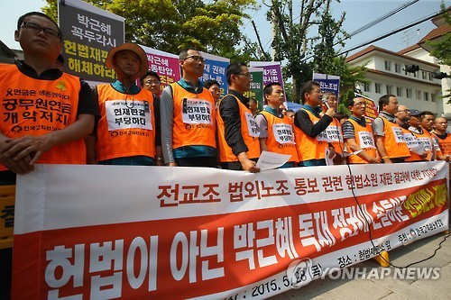 (서울=연합뉴스) 설승은 기자 = 전국교직원노동조합은 28일 전교조의 법외노조 판단 근거가 된 교원노조법 2조에 대한 헌법재판소의 합헌 결정에 즉각 반발했다.