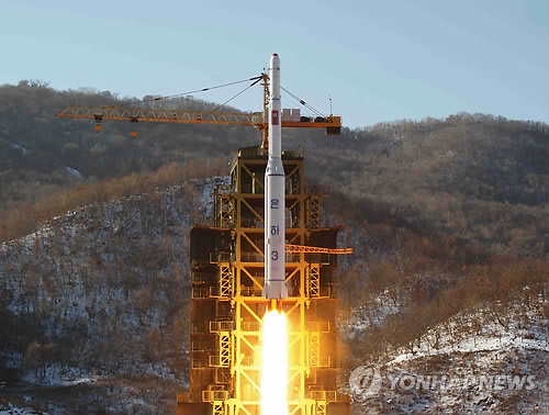 | △ 2012년 12월 평안북도 철산군 동창리 서해위성발사장에서 '은하 3호' 로켓이 발사되는 모습. (AP/조선중앙통신=연합뉴스 자료사진) |