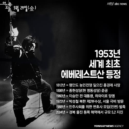 1953년 5월29일 뉴질랜드 산악인 에드먼드 힐러리(1919∼2008)와 네팔 셰르파족 텐징 노르가이(1914∼1986)가 세계 최고봉 에베레스트산 등정에 성공했다. 힐러리는 훗날 인터뷰에서 '산이 아니라 자신을 정복했다'는 말을 남겼다.
