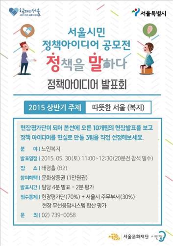 (서울=연합뉴스) 황희경 기자 = 5월의 마지막 토요일인 30일 시민이 제안한 복지정책을 시민들이 직접 듣고 평가하는 자리가 마련된다.