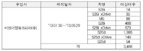 리콜대상은 2013년 1월30일∼6월29일 제작된 BMW 5시리즈 승용차 3천488대와 수리용 공급부품 1천873개다.