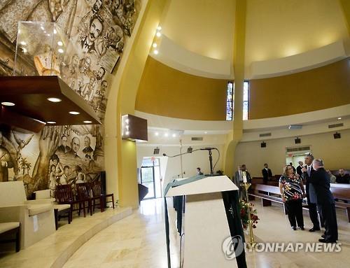 오바마 대통령은 이날 성당에 도착해 신도들에게 '올라'(hola·헬로라는 뜻)라고 인사를 건넨 뒤 예수와 성모 마리아, 크리스토퍼 콜럼버스, 쿠바의 독립 영웅 호세 마르티를 그린 성당 내부 벽화를 감상하기도 했다고 백악관은 전했다.