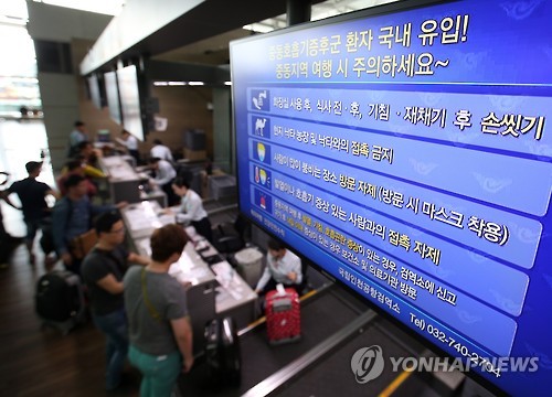 | △ '메르스' 주의보 (영종도=연합뉴스) 한종찬 기자 = 중동호흡기증후군(메르스) 환자가 2명이 추가로 발생해 국내 메르스 감염 환자가 9명으로 늘어난 29일 오후 인천공항에 설치된 모니터에 중동호흡기증후군(메르스) 관련 중동지역 여행시 주의사항이 나오고 있다. |