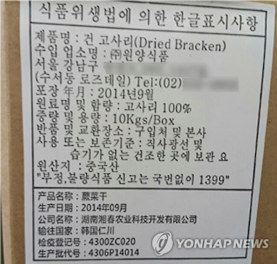 | △ 카드뮴 기준초과 검출 수입 '건 고사리' 회수조치 (서울=연합뉴스) 식품의약품안전처는 ㈜원양식품이 수입·판매한 '건 고사리'에서 카드뮴이 기준초과 검출돼 해당 제품을 회수·폐기조치 중이라고 29일 밝혔다. 회수 대상 제품은 포장년월이 2014년 9월인 제품이다. (식약처 제공) |