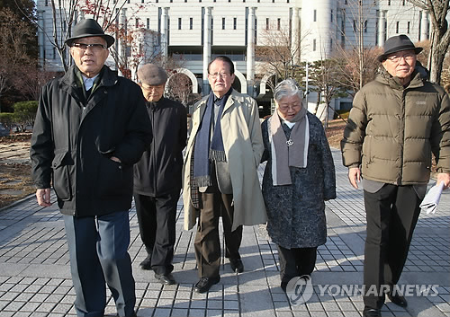 | △ 사상 최악의 사법 살인으로 이어진 '1차 인민혁명당 사건'의 피해자 고(故) 도예종씨 등 9명이 재심에서 무죄 확정 판결을 받았다. 1965년 대법원에서 유죄 판결을 받은 지 50년 만이다. 사진은 2013년 11월 28일 서울 서초구 서초동 서울고법에서 열린 재판이 끝난 뒤 '1차 인민혁명당 사건'의 당사자와 유족 등이 법정을 나서고 있는 모습. (연합뉴스 자료사진) |