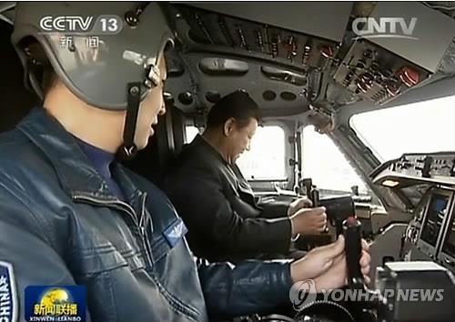 | △ 공군부대를 시찰 도중 폭격기 조종을 체험하고 있는 시진핑 |