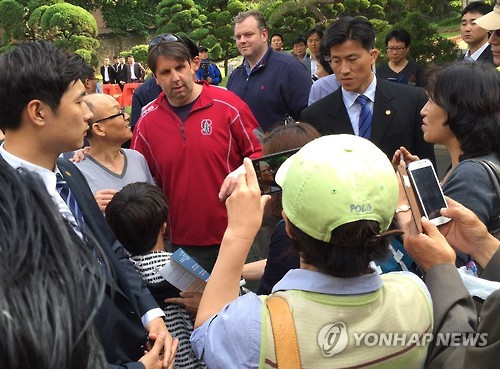 | △ 시민들과 인사 나누는 리퍼트 대사 (서울=연합뉴스) 리퍼트 주한 미국대사가 30일 정동 야행축제 일환으로 자신의 관저를 개방하고 운동복 차림으로 관저에 나와 시민들과 인사하고 있다. 2015.5.30 << 중구청 제공 >> photo@yna.co.kr |