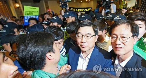 고용노동부는 28일 오후 여의도 CCMM 빌딩에서 '임금체계 개편과 취업규칙 변경 공청회'를 열려고 했다. 그러나 민주노총과 한국노총 조합원 200여명이 행사장을 점거하며 시위를 벌이는 바람에 공청회 개최가 무산됐다.