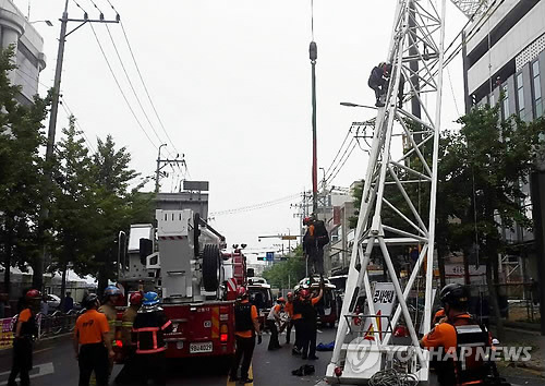 | △ 강동구 공사장서 타워크레인 해체중 사고…2명 부상 (서울=연합뉴스) 31일 오전 서울 강동구 천호동 한 주상복합 신축공사장 타워크레인 사고현장에서 강동소방서 대원들이 부상자들을 구조하고 있다. (강동소방서 제공) |