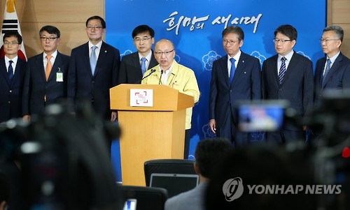 | △ 문형표, 메르스 대응 민관 합동대책 브리핑 (서울=연합뉴스) 전수영 기자 = 문형표(가운데 노란상의) 보건복지부 장관이 31일 오전 서울 세종로 정부종합청사에서 메르스 확산 방지 브리핑을 하고 있다. 문 장관은 "정부는 앞으로 1주일간이 메르스 확산이냐 진정이냐의 기로로 판단하고 있다"며 "메르스(중동호흡기증후군) 3차 감염을 통한 확산을 방지하기 위해 전 국가적인 역량을 집중하겠다"고 밝혔다. |