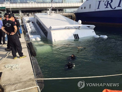| △ 바닷물에 잠긴 쾌속선 (목포=연합뉴스) 31일 오전 5시 12분께 목포시 항동 여객선터미널 계류장에 정박된 목포선적 477t 쾌속선 N호가 침수됐다. 3분의 2가량 바닷물에 잠겼지만 배에 탄 사람이 없어 인명피해는 발생하지 않았다. (목포해경안전서 제공) |