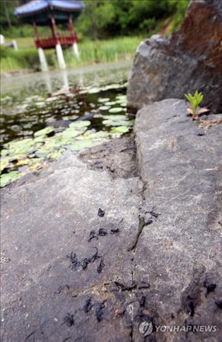 31일 환경단체 '두꺼비친구들'에 따르면 전날 오전 청주시 현도면 달계리의 한 연못에서 나와 서식지로 이동하던 새끼두꺼비 수십 마리가 연못 주변의 바위에서 말라 죽은 채 발견됐다.