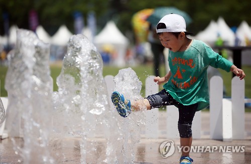 | △ <연합뉴스 자료사진> (서울=연합뉴스) 박동주 기자 = 낮 기온이 30도를 웃도는 등 더운 날씨를 보인 31일 한 어린이가 시청 앞 서울광장 분수대에서 물놀이를 즐기며 더위를 식히고 있다. 2015.5.31 pdj6635@yna.co.kr |
