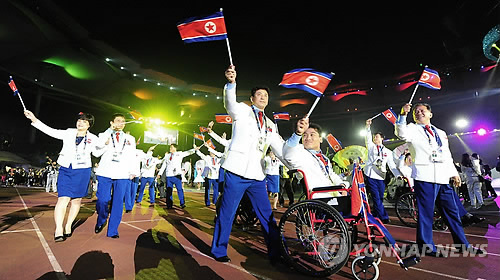 | △ 경기장 들어서는 북한 선수단 (인천=연합뉴스) 윤태현 기자 = 2014 인천 장애인 아시안게임 마지막 날인 24일 인천 문학경기장에서 열린 폐막식에서 북한 선수단이 경기장으로 들어서고 있다. 2014.10.24 tomatoyoon@yna.co.kr |