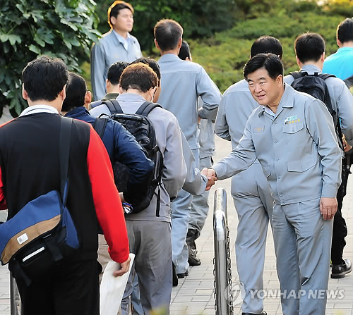 | △ 지난해 회사의 어려움을 극복하는데 힘을 모아달라며 출근길 임직원과 만나는 권오갑 현대중공업 사장. <<연합뉴스 자료사진>> |