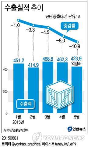 정부는 이달 중으로 수출 활성화를 위한 종합대책을 내놓을 계획이다. 이런 상황에서 지난 5월 수출이 1년 전보다 10.9% 줄어 2009년 8월 이후 5년9개월 만에 최대 감소폭을 기록한 것으로 나타나 긴장감이 커졌다. 덩달아 정부 대책의 강도도 세질 전망이다.