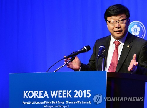 | △ 환영사하는 주형환 차관 (서울=연합뉴스) 주형환 기획재정부 차관이 1일 인천 연수구 송도 쉐라톤 호텔에서 열린 '세계은행 가입 60주년 한국주간행사' 개막식에서 환영사를 하고 있다. 2015.6.1 << 기획재정부 제공 >> photo@yna.co.kr |