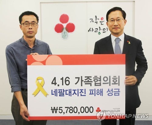 (서울=연합뉴스) 설승은 기자 = 사회복지공동모금회는 세월호 참사 피해자로 구성된 416가족협의회가 네팔 지진 피해복구 성금으로 578만원을 기부했다고 1일 밝혔다.