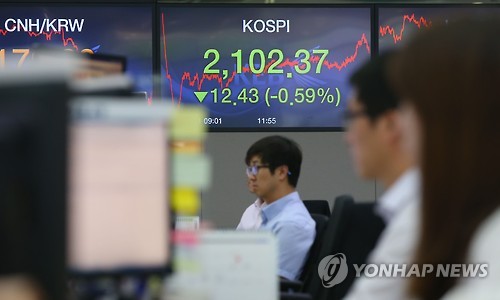 | △ 코스피 2,100선 턱걸이 (서울=연합뉴스) 김도훈 기자 = 코스피가 전 거래일보다 12.43포인트(0.59%) 내린 2,102.37로 장을 마감한 1일 오후 서울 중구 외환은행 본점 딜링룸에서 직원들이 업무를 보고 있다. superdoo82@yna.co.kr |