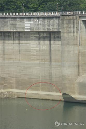 | △ (충주=연합뉴스) 공병설 기자 = 가뭄에 때이른 불볕더위까지 겹치면서 수도권 용수원인 충주댐 수위가 1일 현재 115.8m 부근까지(붉은원 안) 내려와 있다. 충주댐의 사상 최저 수위는 1997년 2월 28일 기록된 113.59m다. <<연합뉴스 DB>> |