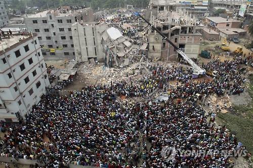 | △ 2013년 4월 25일 방글라데시 다카 외곽의 라나플라자 공장 붕괴 현장에서 구조당국이 생존자를 수색하는 것을 시민들이 지켜보고 있다.(AP=연합뉴스) |