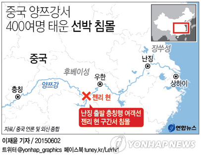 (서울=연합뉴스) 이윤영 권수현 기자 = 중국 후베이성(湖北)의 양쯔강에서 1일(현지시간) 오후 9시28분께 440여명을 태운 여객선 '둥팡즈싱'(東邦之星·동쪽의 별)호가 침몰했다고 신화통신이 2일 보도했다.