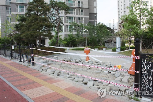 | △ "공공보행통로 수개월째 공사중" (용인=연합뉴스) 강창구 기자 = 경기도 용인 광교신도시 한 아파트단지에서 인근 임대아파트 주민들의 통행을 방해하기 위해 파놓은 공사현장. 공공보행통로의 보도블록을 교체한다며 수개월째 땅을 파놓고 방치하고 있다. 2015.6.2 kcg33169@yna.co.kr |