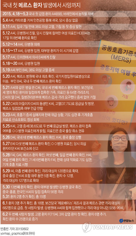 (서울=연합뉴스) 김병규 기자 = 1일 숨진 메르스 환자 S(58.여)씨는 메르스 감염 증상이 발현된 지난달 25일부터 6일 동안이나 보건당국의 통제와 치료를 받지 못했다.