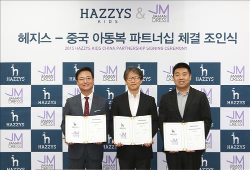 | △ 6월 2일 서울 압구정동 LF 본사에서 LF의 아동복 브랜드 헤지스키즈와 중국 아동복 전문 기업 '지아만'이 업무협약을 맺었다. LF 대표이사 오규식 사장(가운데)과 중국 지아만의 리우 웨이 사장(오른쪽), 파스텔세상 장인만 사장(왼쪽)이 기념촬영을 하고 있다 |