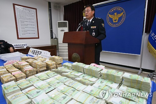| △ 10억대 보이스피싱 사기단 등친 중국·대만 폭력배 검거 (서울=연합뉴스) 박지호 기자 = 보이스피싱으로 국내에서 10억원대를 챙긴 사기단이 환전을 하려다 중국·대만 폭력배들에게 돈을 빼앗긴 일이 벌어졌다고 2일 서울 광진경찰서가 밝혔다. 이혁 광진경찰서 형사과장이 2일 오전 서울 광진경찰서에서 증거물을 앞에 두고 사건 관련 브리핑을 하고 있다. |