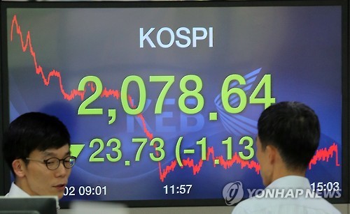 종가 기준으로 코스피가 2,080선 밑으로 떨어진 것은 지난달 9일 이후 처음이다.