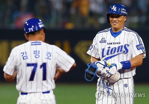 | △ 이승엽, '기록은 다음 기회에' (포항=연합뉴스) 김준범 기자 = 2일 경북 포항야구장에서 열린 2015프로야구 롯데 대 삼성 경기. 8회말 1사 만루 때 삼성 이승엽이 2타점 2루타를 쳐내고 김평호 코치를 바라보며 웃고 있다. 이승엽은 대망의 400홈런에 단 1개만을 남겨두고 있다. 2015.6.2 psykims@yna.co.kr |