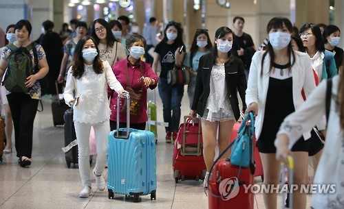 | △ 메르스 확산 '유커 특수' 타격 현실화…300여명 방한 취소 (영종도=연합뉴스) 임헌정 기자 = 중동호흡기증후군(메르스) 여파로 유커(遊客·중국인 관광객) 300여명이 한국 여행을 취소한 것으로 나타났다. 지난해 610만명이 방한, 우리나라의 관광·유통산업을 떠받쳤던 '유커 특수'가 메르스 확산으로 타격을 받을 수 있다는 우려가 현실화하고 있다. 사진은 마스크를 착용하고 2일 오후 인천국제공항에 입국하는 외국인 관광객들. 2015.6.2 kane@yna.co.kr |