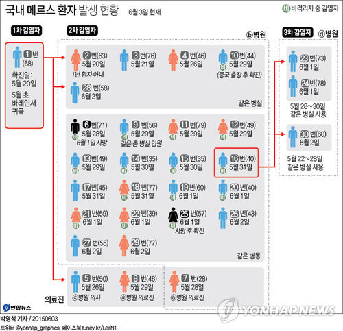 30번(60) 환자는 16번(40) 환자와 지난달 22~28일 ⓓ 병원에서 같은 병실을 사용한 3차 감염자다.