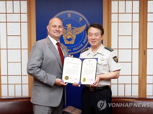 (서울=연합뉴스) 구정모 기자 = 경찰청은 3일 주한 미8군의 리키 옥센다인 비상운영기획 본부장에 감사장을 수여했다.