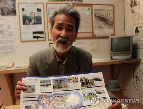 | △ 다카자네 야스노리(高實康稔) 일본 나가사키(長崎)대 명예교수가 3일 오후 나가사키시 소재 '오카 마사하루 기념 나사가키 평화자료관'에서 하시마(端島, 일명 '군함도')에 관해 설명하고 있다. |