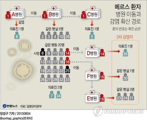1번 환자는 지난달 15∼17일 ⓑ병원에서 치료를 받았으며, 지금까지 확인된 환자 35명 가운데 28명이 이곳에서 감염된 것으로 추정된다.