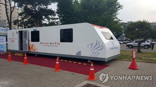 | △ 인기 캐러밴 (문경=연합뉴스) 손대성 기자 = 경북 문경 세계군인체육대회 선수 숙소로 사용 예정인 캐러밴(이동식 주택) 견본품이 문경시청 앞마당에 서 있다. 캐러밴 제조업체는 각계 문의가 이어지자 최근 분양 신청을 받고 있다. 2015.6.4 sds123@yna.co.kr |