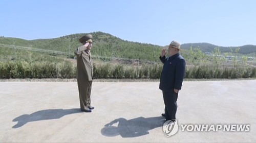 북한 조선중앙TV는 4일 '경애하는 최고사령관 김정은 동지께서 인민군대사업을 현지에서 지도'라는 제목의 새 기록영화에서 박영식이 지난달 29일 인민무력부 산하 종합양묘장 건설현장에서 김정은 제1위원장에게 경례하는 모습을 방영했다.