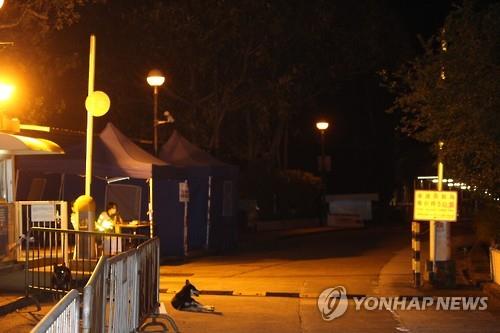 | △ (홍콩=연합뉴스) 최현석 특파원 = 2일(현지시간) 메르스 감염 의심자들이 격리된 맥리호스부인 휴양촌 앞을 경찰관과 민중안전복무대 대원, 휴양촌 보안요원들이 3중 철통 경비 서고 있다. 경비견 두마리도 눈에 띄었지만, 지나가는 사람이 한 명도 없어 적막감이 감돌았다. 2015.6.3 |